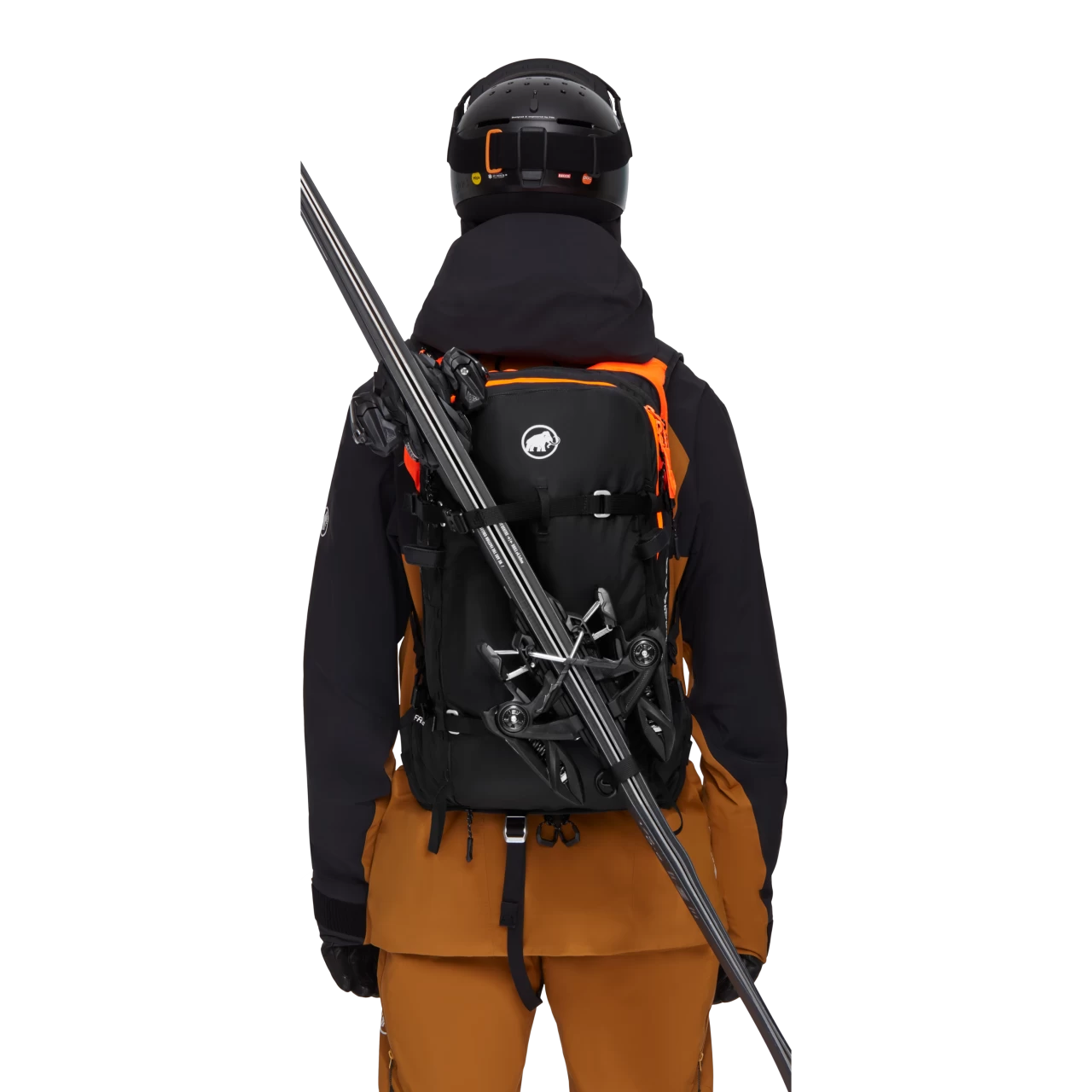 Klein im Gewicht, gross bei den Funktionen. Der Free 22 Removable Airbag 3.0 ist leicht und bietet alles, was du von einem Lawinenrucksack erwartest. Das Mammut Airbag System 3.0 ist zuverlässig, langlebig und eines der leichtesten auf dem Markt. Dank Elementen in Orange bist du aus der Ferne besser sichtbar. Das Tragesystem ist von Trailrunningwesten inspiriert, die Last liegt eng am Körper und schaukelt nicht. Für hohen Tragekomfort und passgenauen Sitz sorgen die optimierten Hüft- und Schultergurte sowie der neu entwickelte, 3D-vorgeformte Rücken. Praktisch: Das Hauptfach erreichst du von oben und auch bequem durch einen Reissverschluss am Rücken. Ski oder Snowboard befestigst du sicher mithilfe von Zugbändern. Die Sicherheitsausrüstung verstaust du im separaten Fach – für deine Sicherheit in Orange gehalten. Der Rucksack ist PFC-frei, Aussenstoff und Innenfutter bestehen aus Recyclingmaterial. Praktische Features wie Helmhalterung, seitliche Kompressionsriemen und Halterungen für Stöcke runden den Free 22 ab.