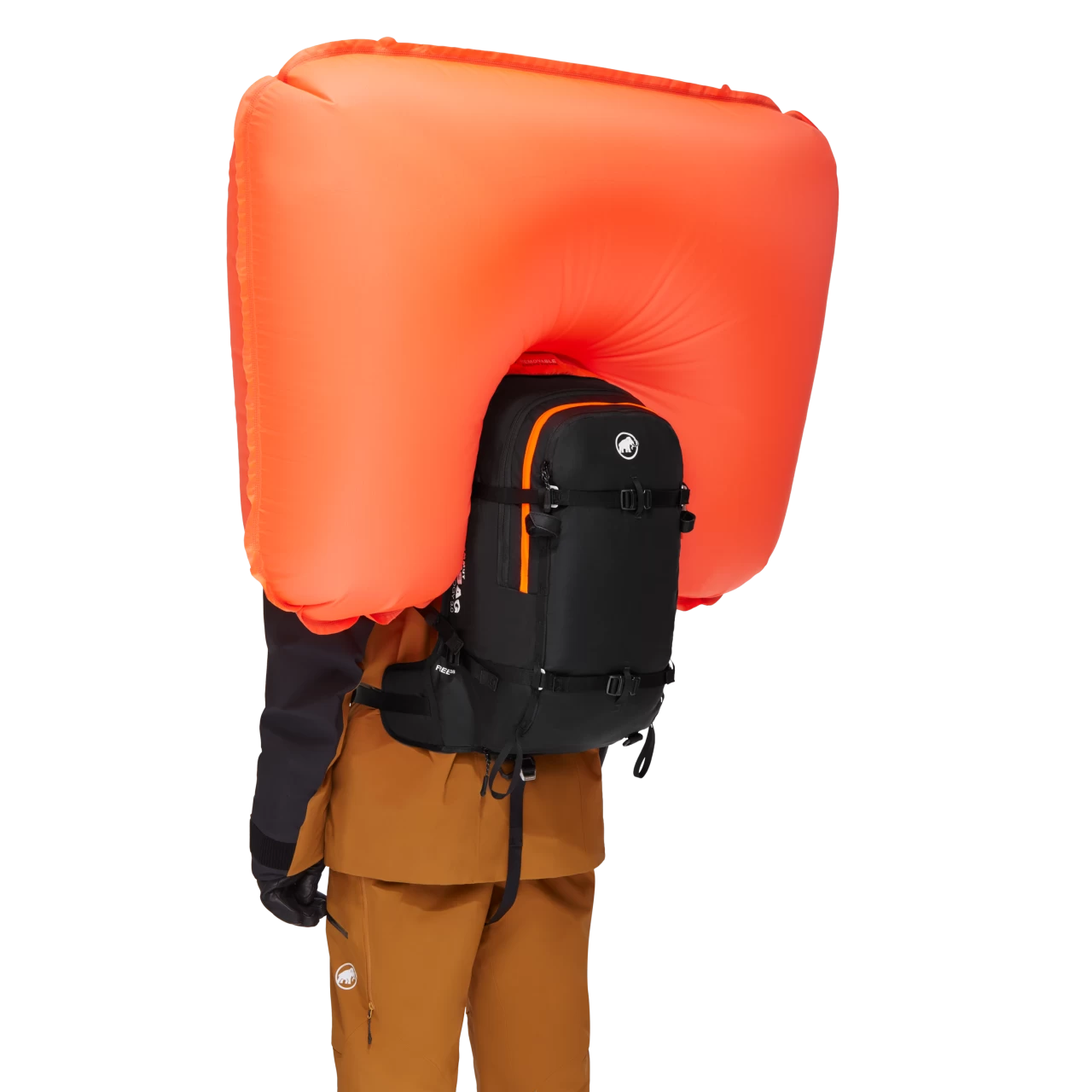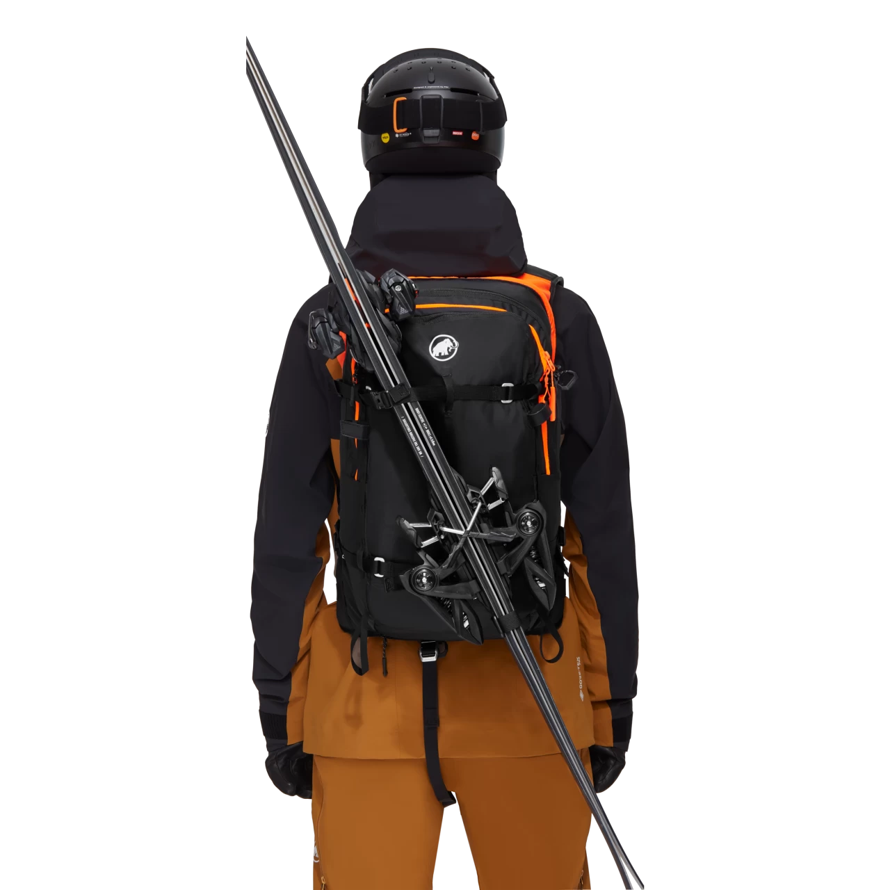Klein im Gewicht, gross bei den Funktionen. Der Free 28 Removable Airbag 3.0 ist leicht und bietet alles, was du von einem Lawinenrucksack erwartest. Das Mammut Airbag System 3.0 ist zuverlässig, langlebig und eines der leichtesten auf dem Markt. Dank Elementen in Orange bist du aus der Ferne besser sichtbar. Das Tragesystem ist von Trailrunningwesten inspiriert, die Last liegt eng am Körper und schaukelt nicht. Für hohen Tragekomfort und passgenauen Sitz sorgen die optimierten Hüft- und Schultergurte sowie der neu entwickelte, 3D-vorgeformte Rücken. Praktisch: Das Hauptfach erreichst du von oben und auch bequem durch einen Reissverschluss am Rücken. Ski oder Snowboard befestigst du sicher mithilfe von Zugbändern. Die Sicherheitsausrüstung verstaust du im separaten Fach – für deine Sicherheit in Orange gehalten. Der Rucksack ist PFC-frei, Aussenstoff und Innenfutter bestehen aus Recyclingmaterial. Praktische Features wie Helmhalterung, seitliche Kompressionsriemen und Halterungen für Stöcke runden den Free 28 ab.