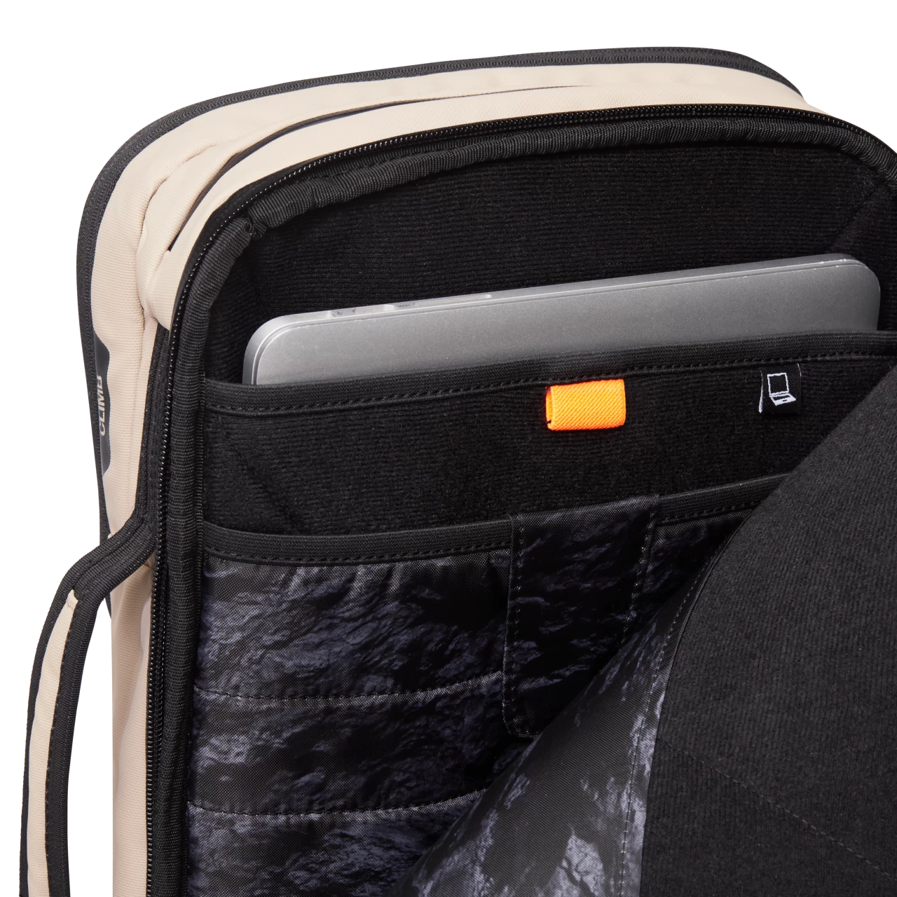 - Wasserabweisendes, von aussen zugängliches, gepolstertes «WORK»-Nebenfach zum Verstauen von Laptop, Tablet und Dokumenten